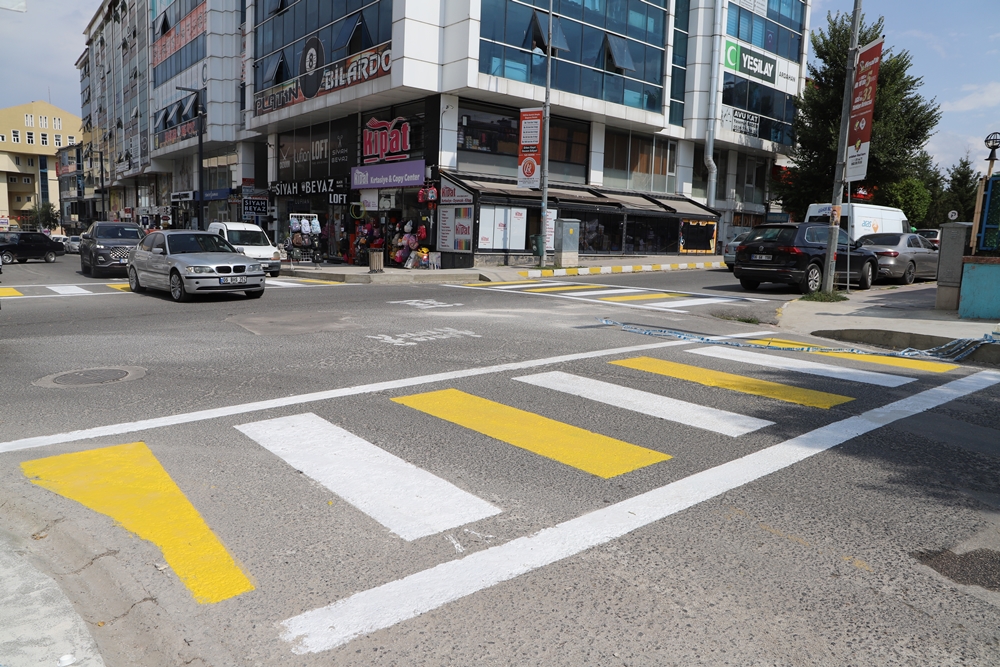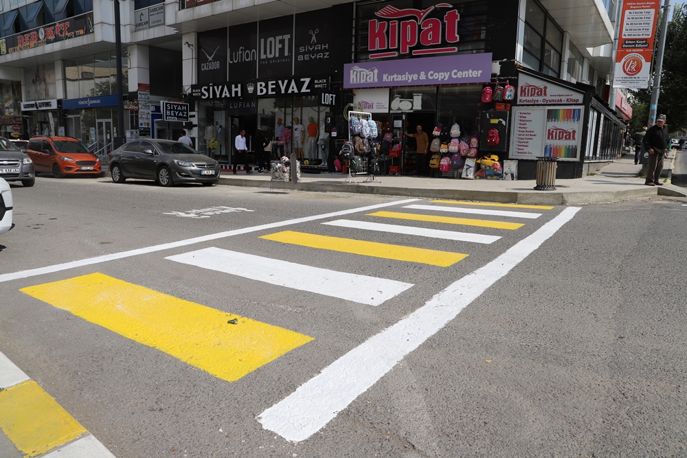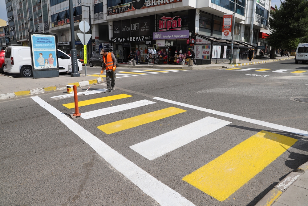 Kentin farklı noktalarında yürütülen çalışmalar doğrultusunda, trafiğin aksamaması için çalışmalar hızlı bir şekilde tamamlanarak, silinmeye yüz tutmuş olan yaya geçidi çizgileri özenle boyandılar.